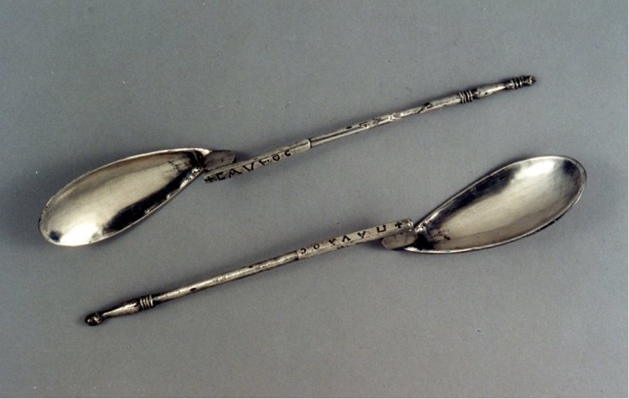 The world famous site of Sutton Hoo contains items reflecting both Germanic warrior culture seen in the “migration period” such as the helmet, a spear, the golden buckle with beautiful animal imagery, shield and knives. But there are also items that show transition. Bede records that Raedwald (AD599-624) converted to Christianity and represented in a few artefacts within the grave at Sutton Hoo including silver Christening spoons. The inscriptions on the spoons read “Paulos” and “Saulos;” these have been interpreted as Christian statements referring St Paul on the road to Damascus. The presence of these spoons among the other artefacts with pagan connotations shows this incorporation of new Christian customs within the existing pagan customs.